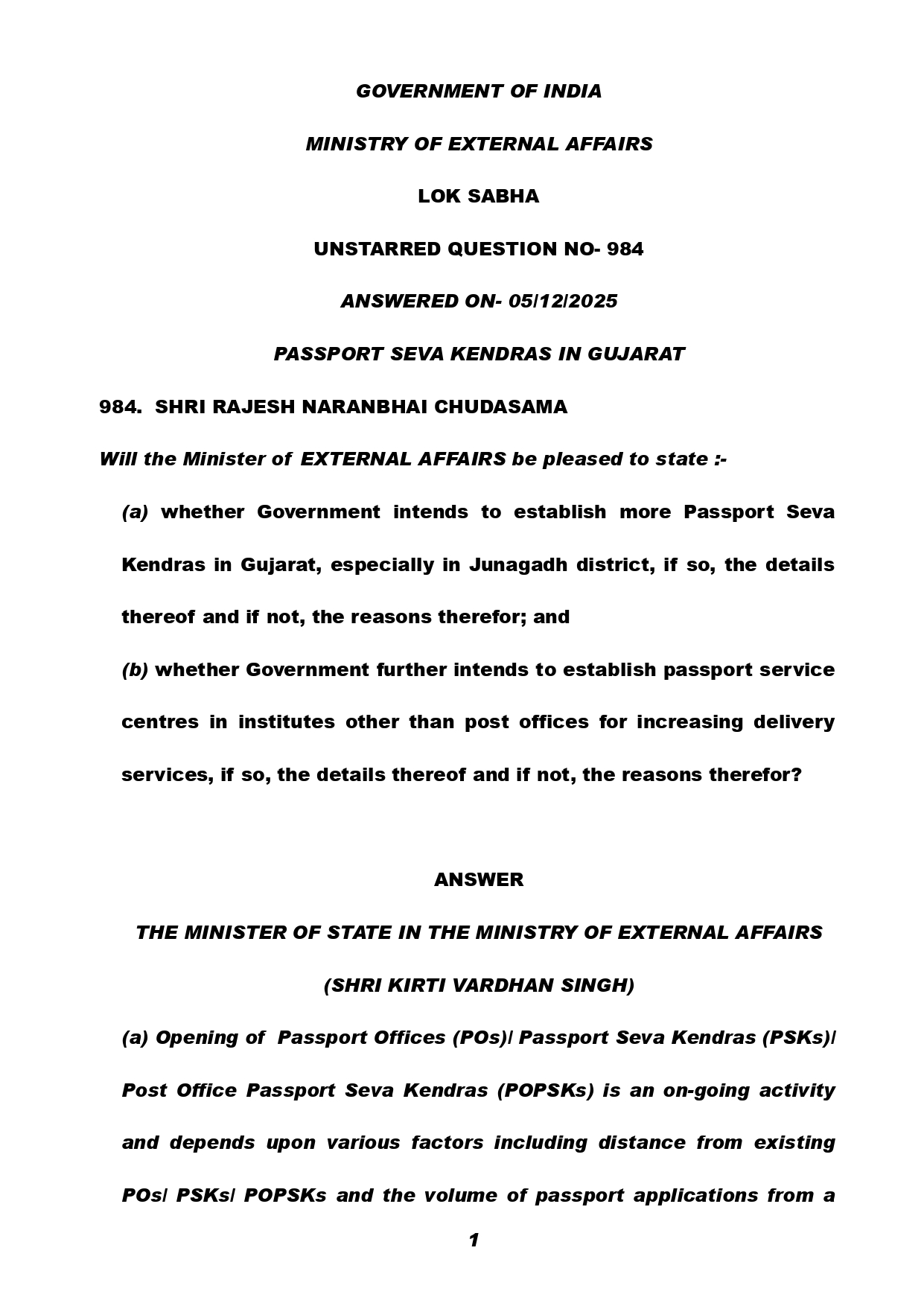 નવી દિલ્હી/જૂનાગઢઃ સંસદના શિયાળુ સત્રના પાંચમા દિવસે જૂનાગઢના સાંસદ રાજેશ ચુડાસમાએ ગુજરાતમાં પાસપોર્ટ સેવા કેન્દ્ર અંગેનો સવાલ પૂછ્યો હતો. તેમણે પૂછ્યું કે, શું સરકારનો વિચાર ગુજરાતમાં ખાસ કરીને જૂનાગઢ જિલ્લામાં પાસપોર્ટ સેવા કેન્દ્ર સ્થાપવાનો છે કે નહીં? જો હા તો તેની શું વિગત છે અને જો ના હોય તો તેનું શું કારણ છે. તેમજ સરકારનો વિચાર વિતરણ સેવાઓ વધારવા માટે પોસ્ટઓફિસો ઉપરાંત અન્ય સંસ્થાઓમાં પણ પાસપોર્ટ સેવા કેન્દ્ર સ્થાપિત કરવાનો છે. જો હા તો તેની વિગત શું છે અને ના તો શું કારણ છે.